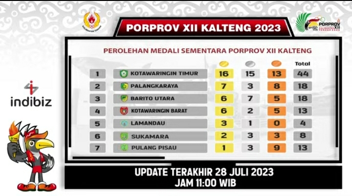 1TULAH.COM – Update perolehan medali Porprov Kalteng 2023 oleh pihak panitia pertanggal 28 Juli 2023 pukul 11.00 WIB. Kotawaringin Barat menyalip Lamandau ke peringkat…